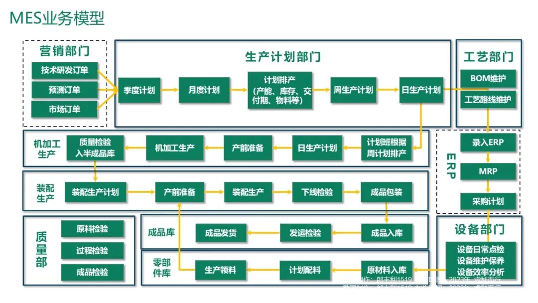 MES贯穿生产全流程,与ERP、工艺、设备、质量、仓库等部门协同,覆盖: