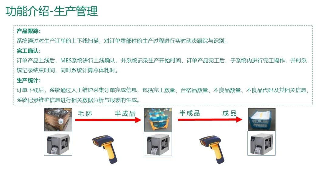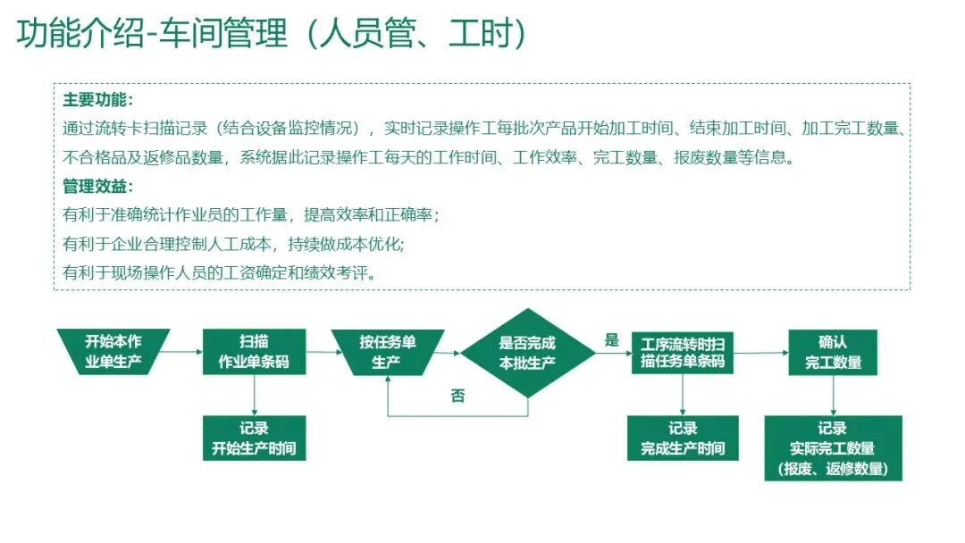 通过扫描流转卡记录每个工序的开始/结束时间、完工数量、不合格品数量