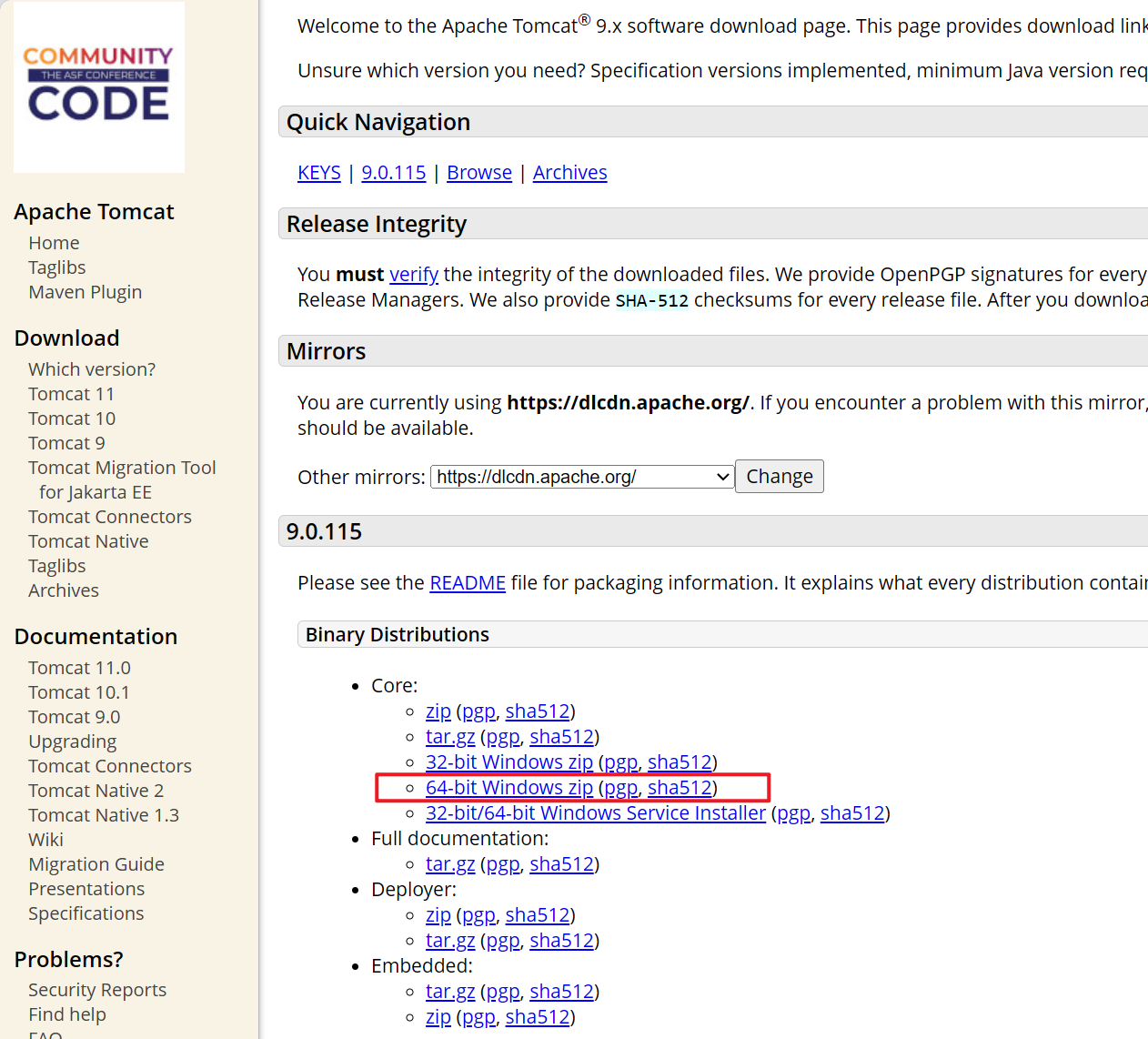 https://tomcat.apache.org/download-90.cgi选择下载版本(本文选择tomcat 9版本为例)