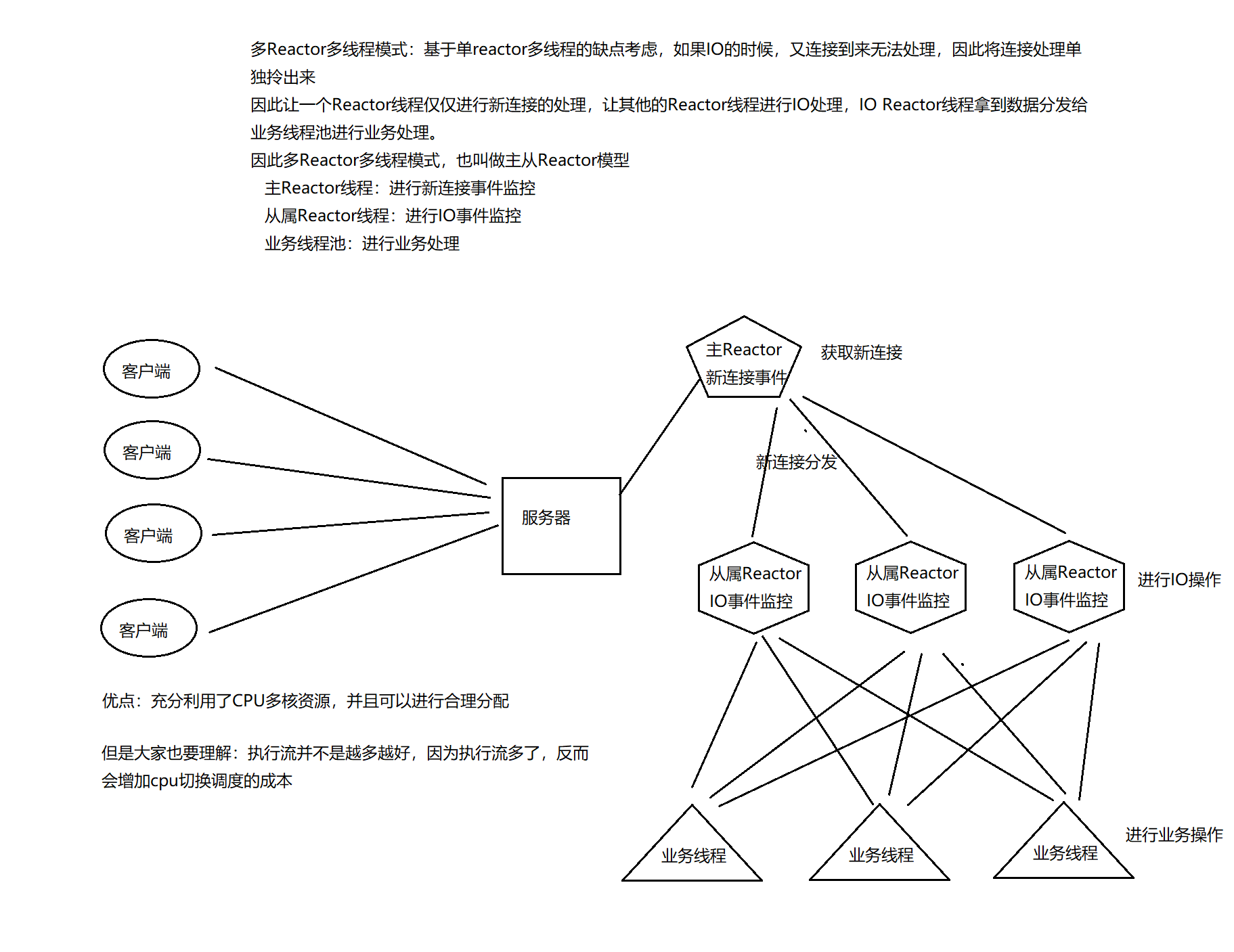 优点:充分利用CPU多核资源,主从Reactor各司其职