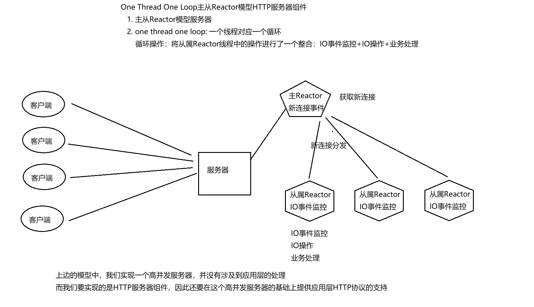 咱们要实现的是主从Reactor模型服务器,也就是主Reactor线程仅仅监控监听描述符,获取新建连接,保证获取新连接的高效性,提高服务器的并发性能。