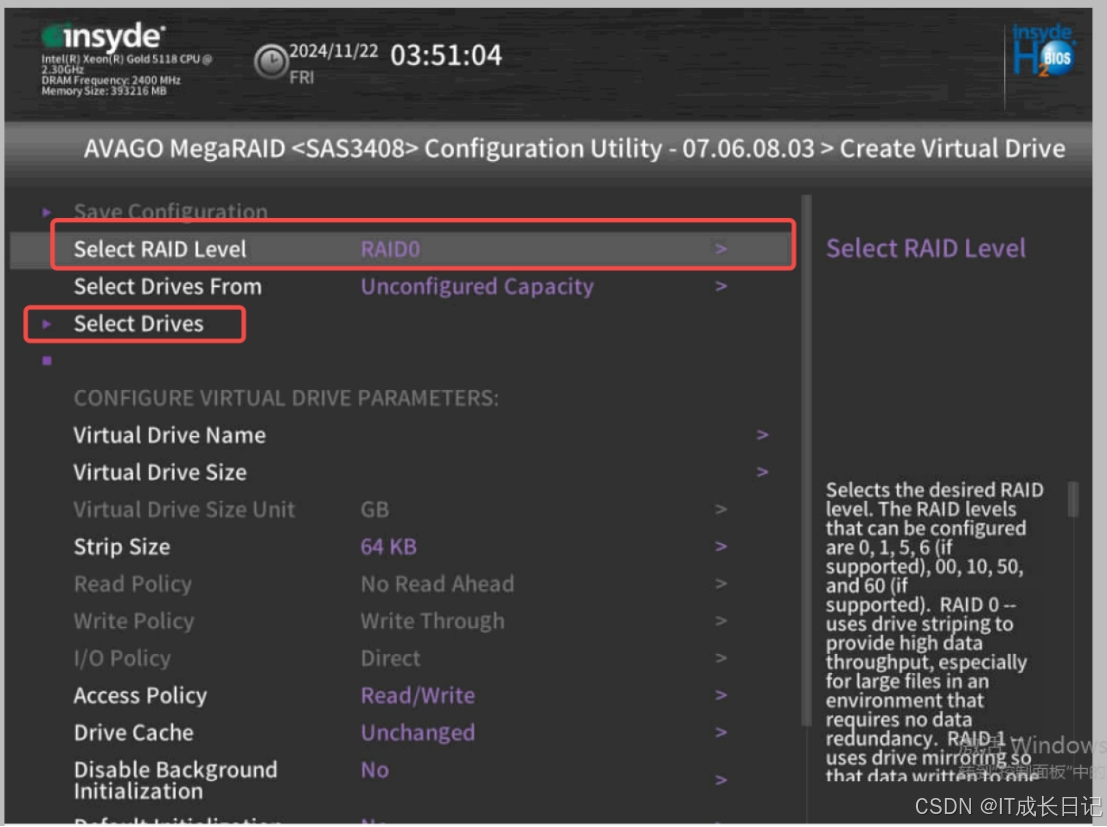 2.按上下键选择:Select RAID Level,再按Enter键,选择需要配置的raid(raid 0/1/5)后再选择:Select Drives,选择对应的硬盘