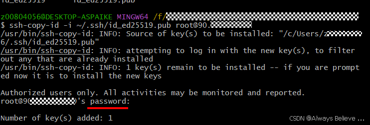 ssh-copy-id -i ~/.ssh/id_rsa.pub root@90.90.90.90 - 然后输入密码。就传输到服务器上了。 成功类似如下
