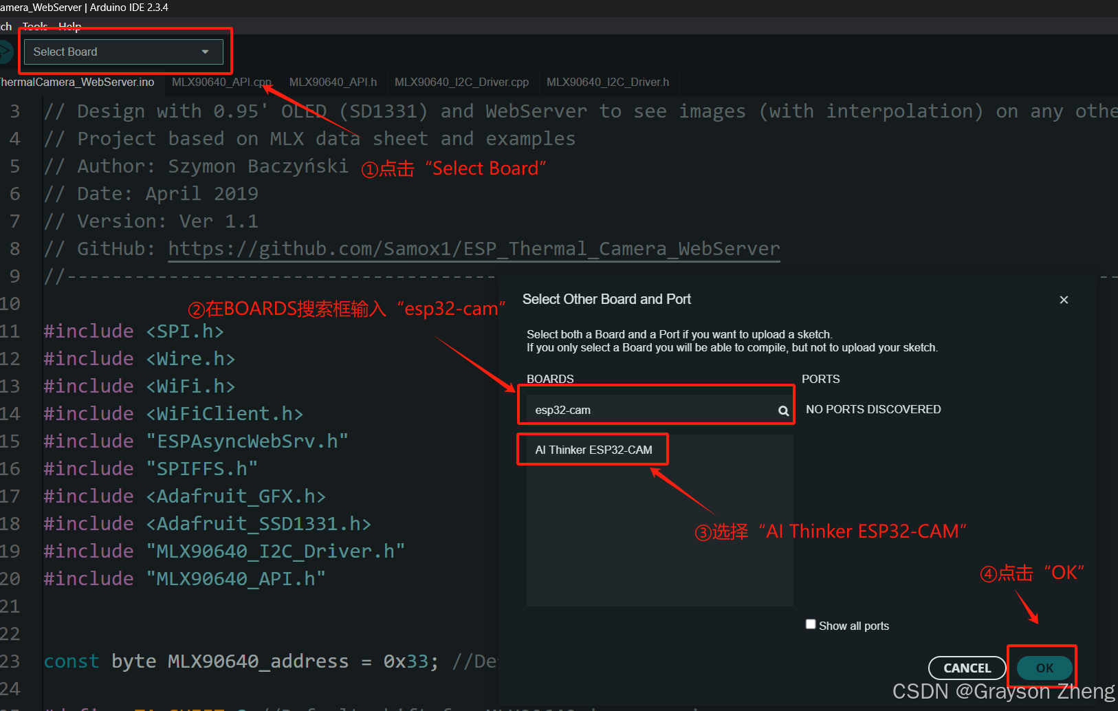 因为 ESP32-CAM 使用的是 AI-Thinker 模型,所以要取消注释 CAMERA_MODEL_AI_THINKER 这个宏定义,并注释所有其他模型。