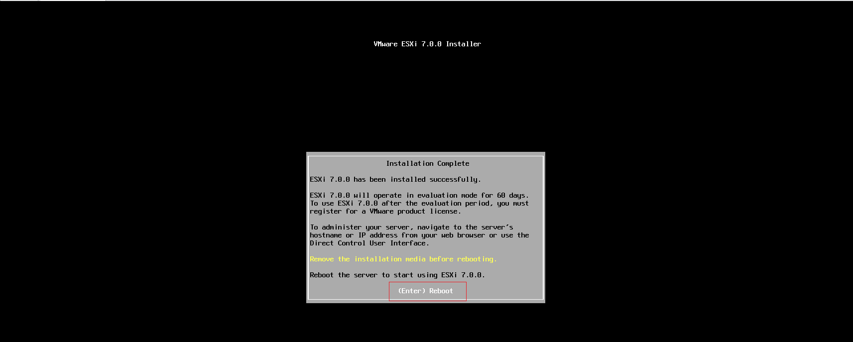 安装完成后,提示需要重启,再次按"Enter" 回车键重启