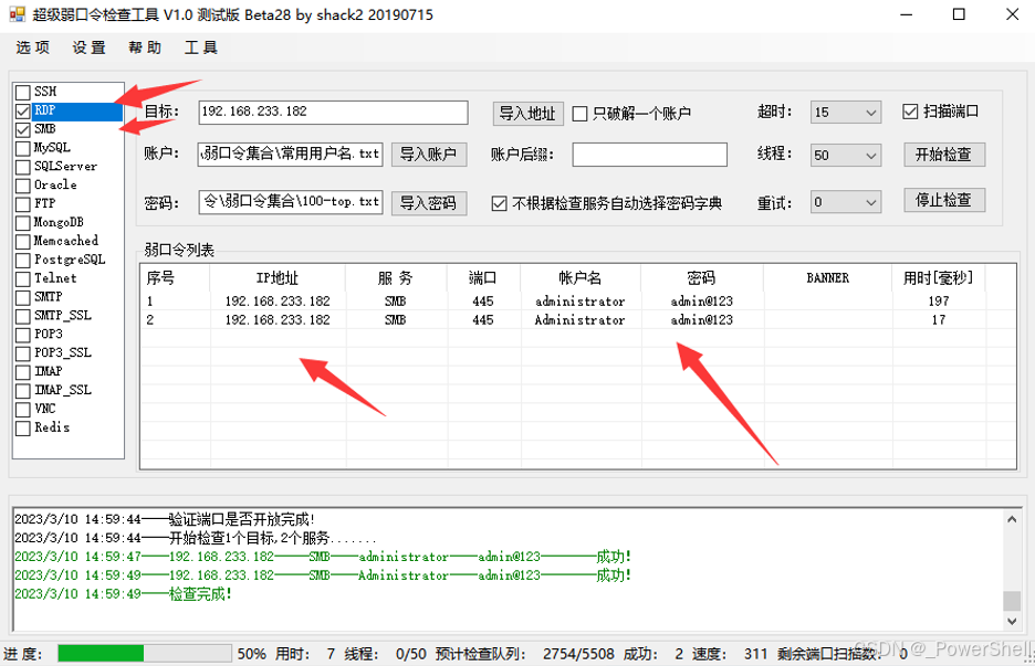 使用超级弱口令检查工具进行爆破 填入目标:192.168.233.182 选择账户字典:常用用户名 选择密码字典:密码top100 对RDP和SMB进行爆破 得到账号密码