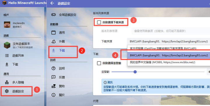 设置中取消勾选自动选择下载源,手动设置源为BMCLAPI
