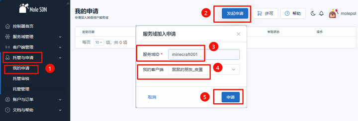 填写服务域ID(前面创建的服务域ID: minecraft001),选择自己要加入的客户端提交申请
