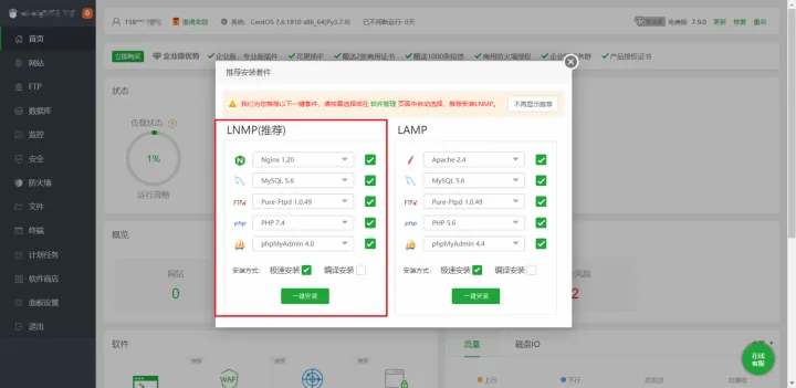这里我推荐安装LNMP,功能强大和性能出色,还能节省服务器内存开销。安装点一键安装就行